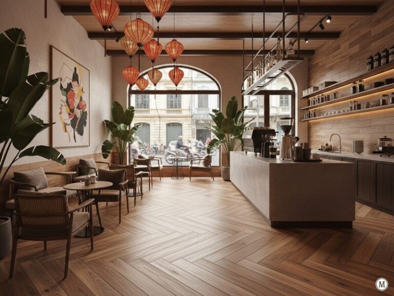 Our stunning wood-look tiles transformed a cozy café in Vietnam, creating a warm and inviting atmosphere that perfectly complements its rustic charm